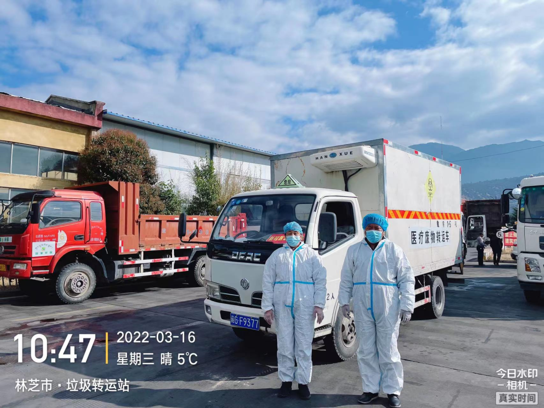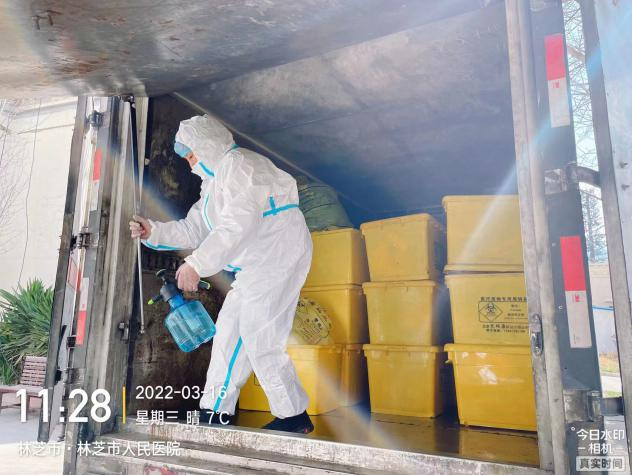 2、消殺完畢后,立即出發(fā)前往林芝市新冠定點(diǎn)醫(yī)院(林芝市人民醫(yī)院)收集轉(zhuǎn)運(yùn)新冠相關(guān)醫(yī)療廢物,與林芝市人民醫(yī)院醫(yī)廢暫存間工作人員確認(rèn)稱(chēng)重并規(guī)范填寫(xiě)危險(xiǎn)廢物轉(zhuǎn)運(yùn)聯(lián)單,收集完畢后對(duì)轉(zhuǎn)運(yùn)車(chē)內(nèi)外進(jìn)行消殺;