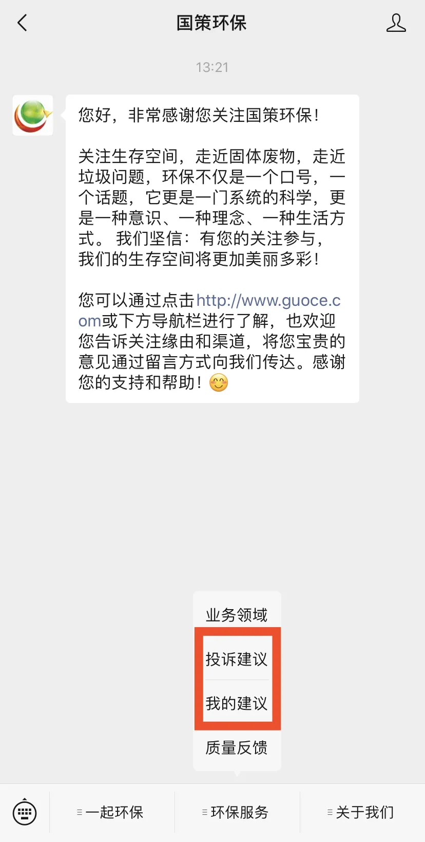 同時,社會公眾可通過關注國策環(huán)保微信公眾號,對國策環(huán)保運營項目的環(huán)衛(wèi)質(zhì)量和服務水平提出意見和建議,對保潔不到位、清運不及時的路段或點位拍照上傳,反饋到云平臺,國策環(huán)保將根據(jù)處理進度,推送處理結果,達到社會共治的創(chuàng)舉。
